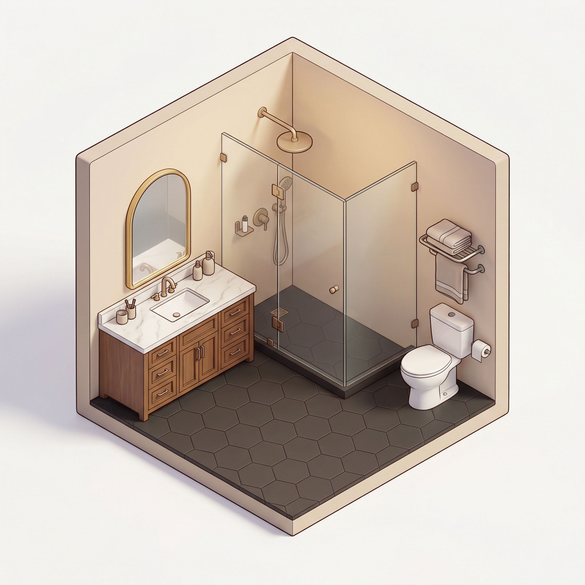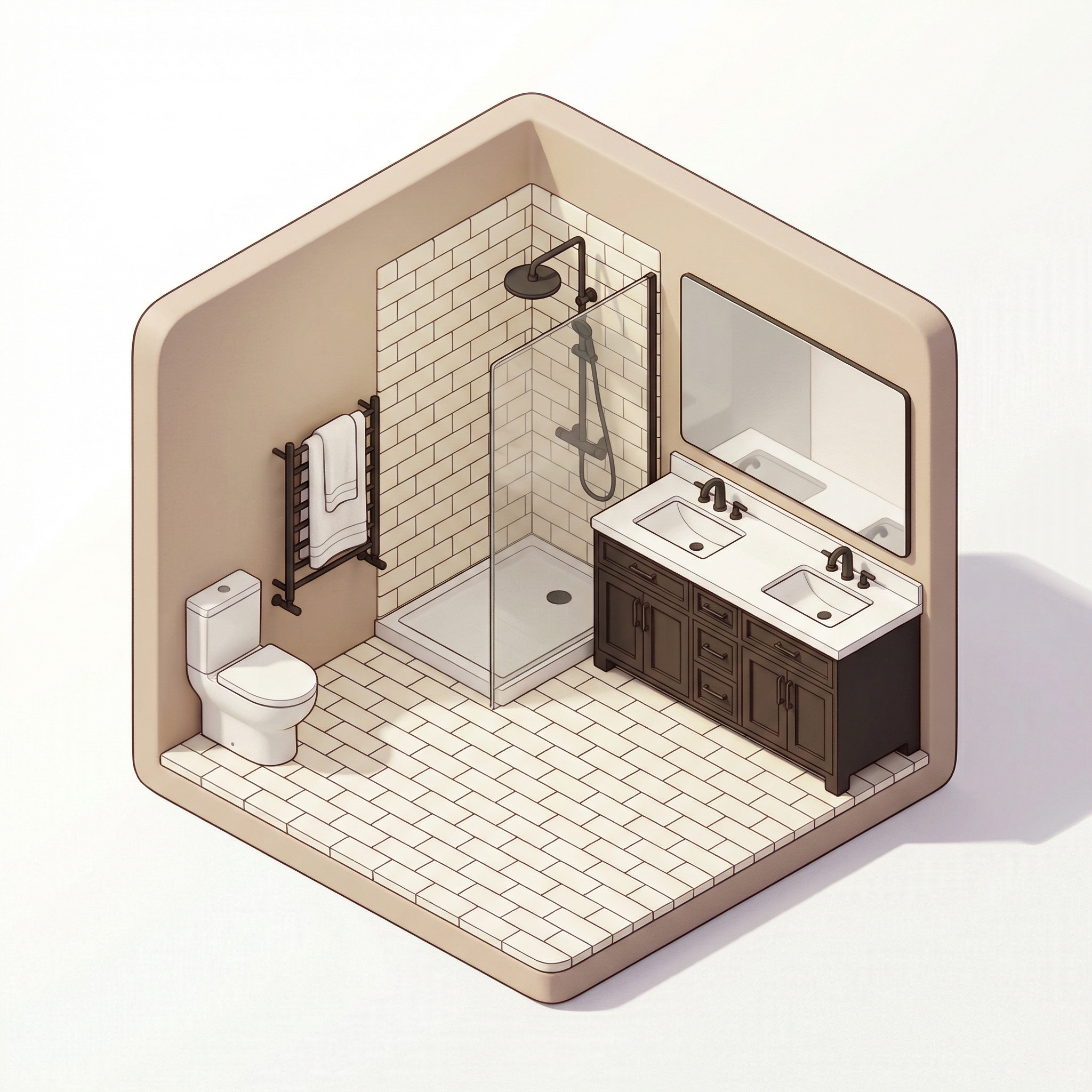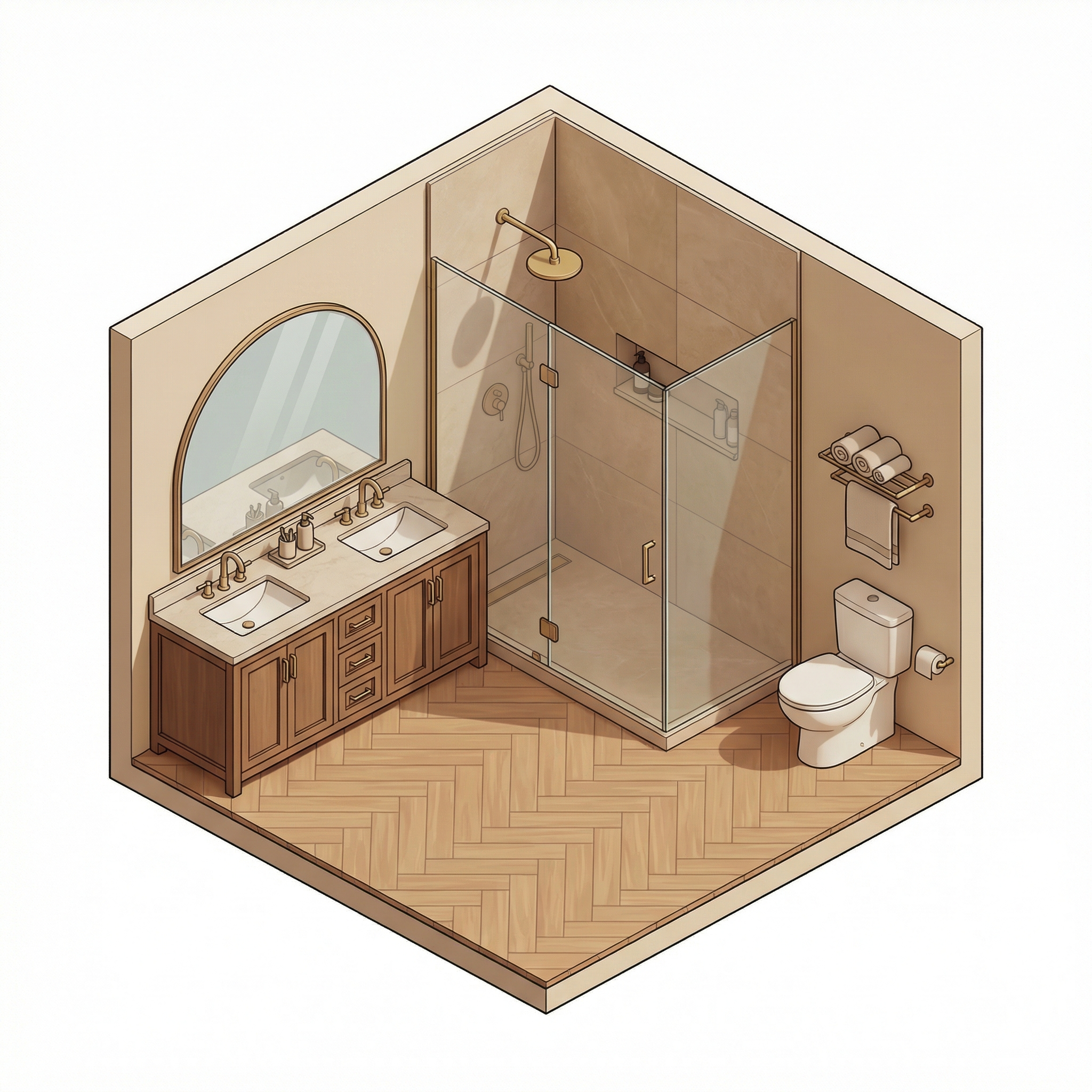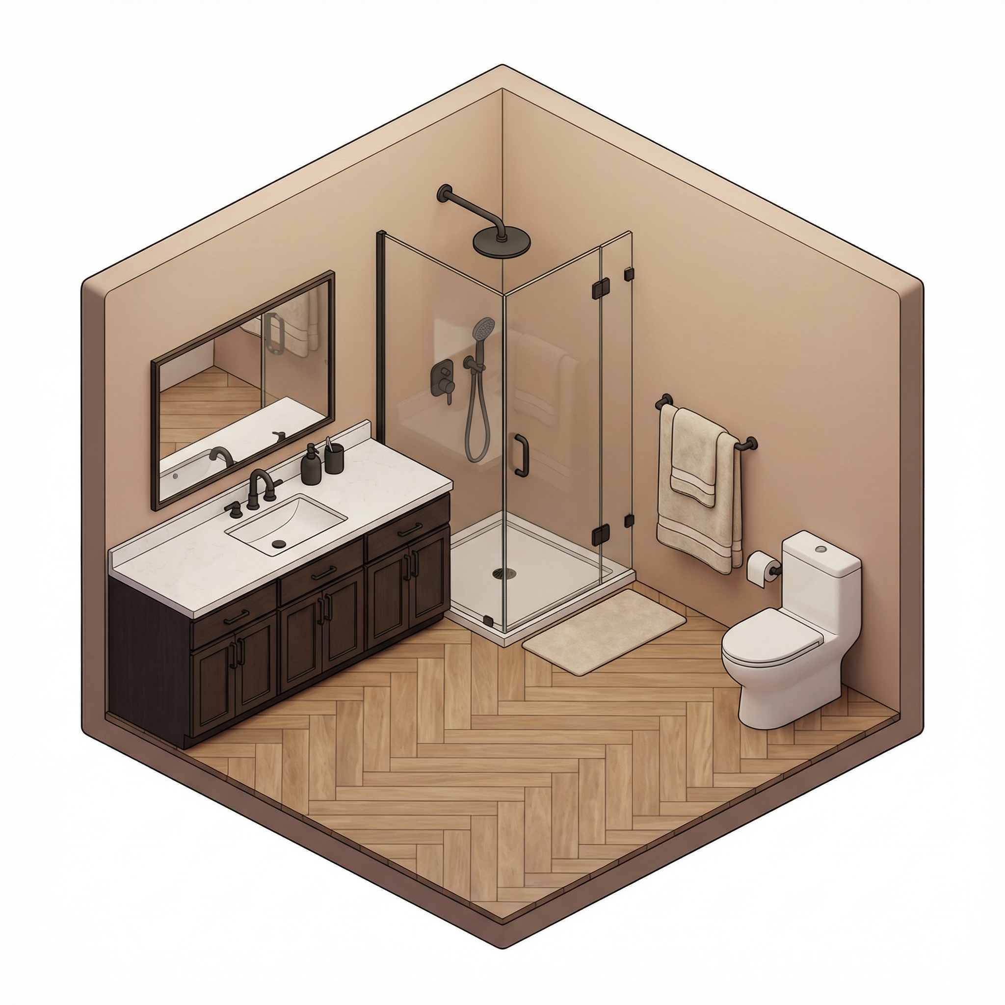 Tap any option to see changes live. Floor tile and vanity swap the 3D scene.