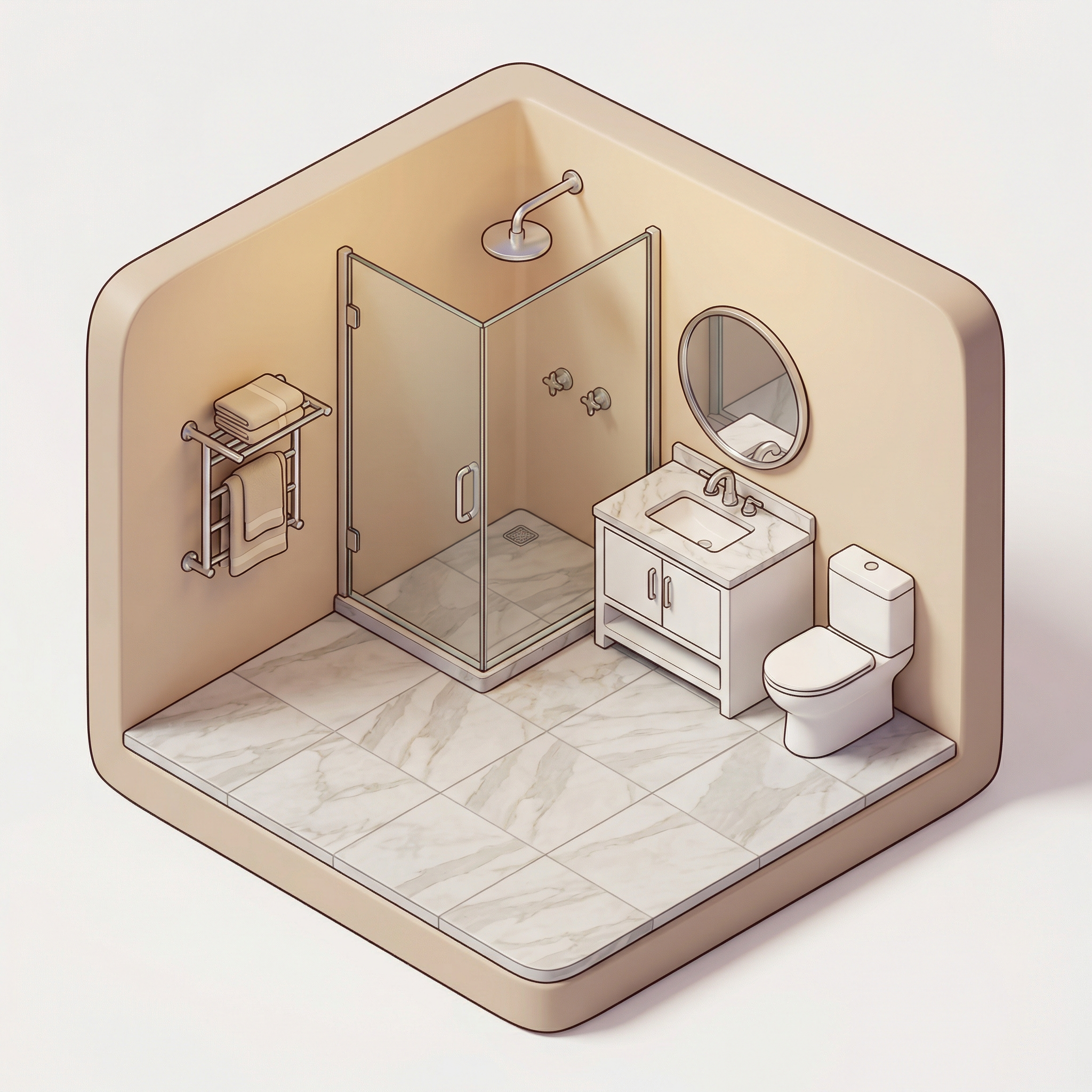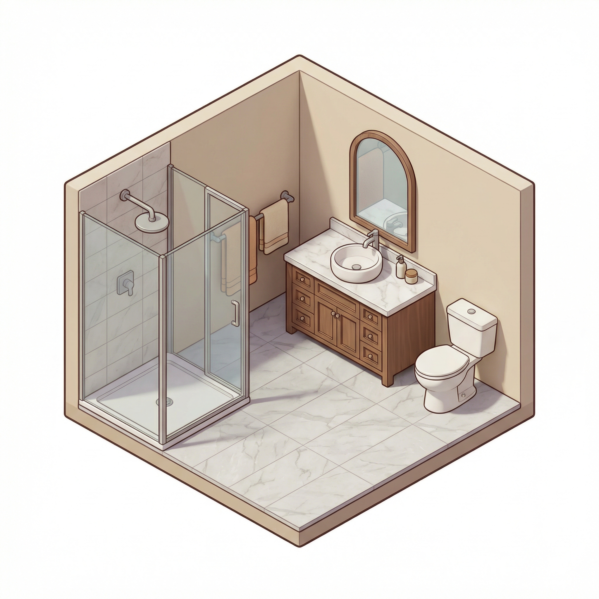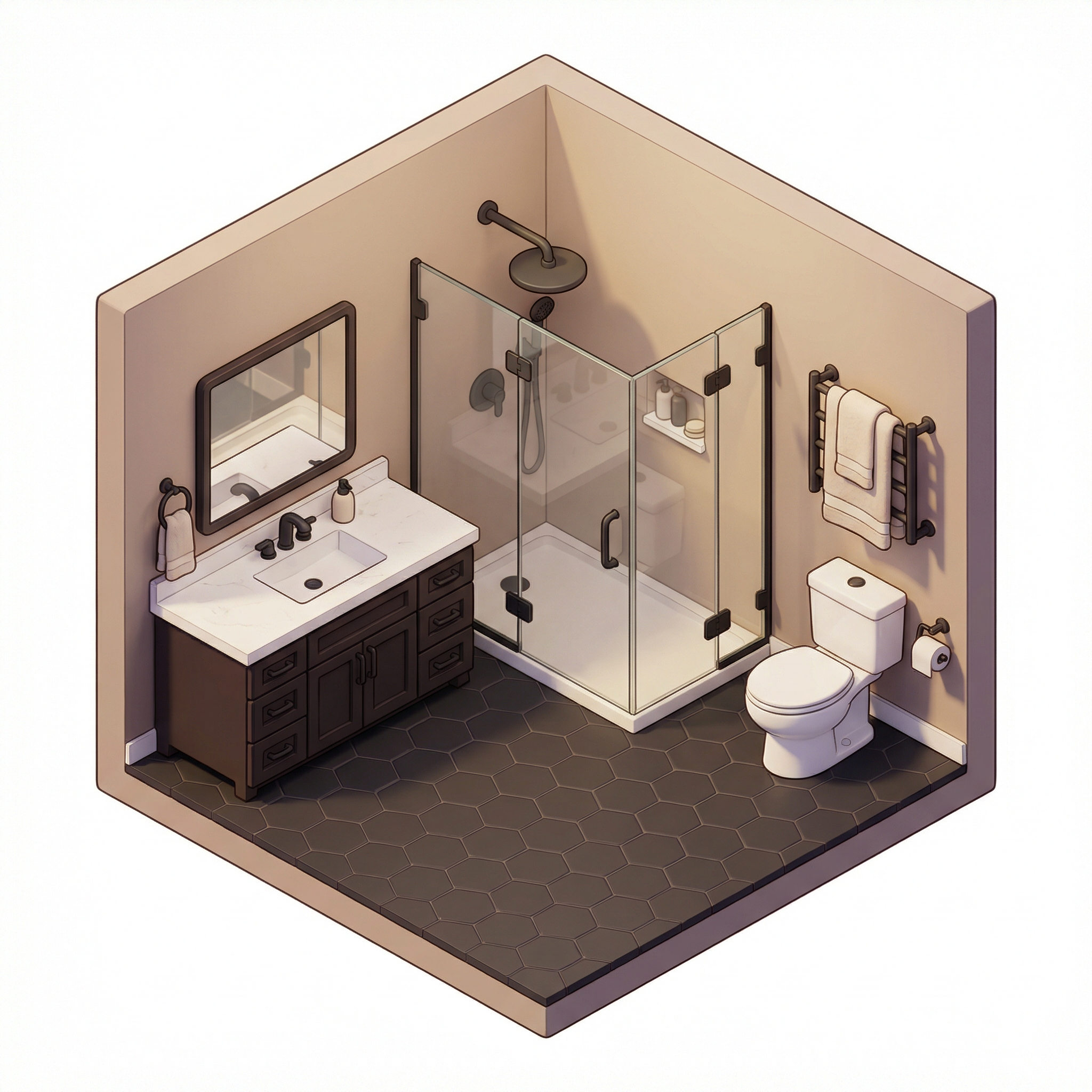 Tap any option to see changes live. Floor tile and vanity swap the 3D scene.