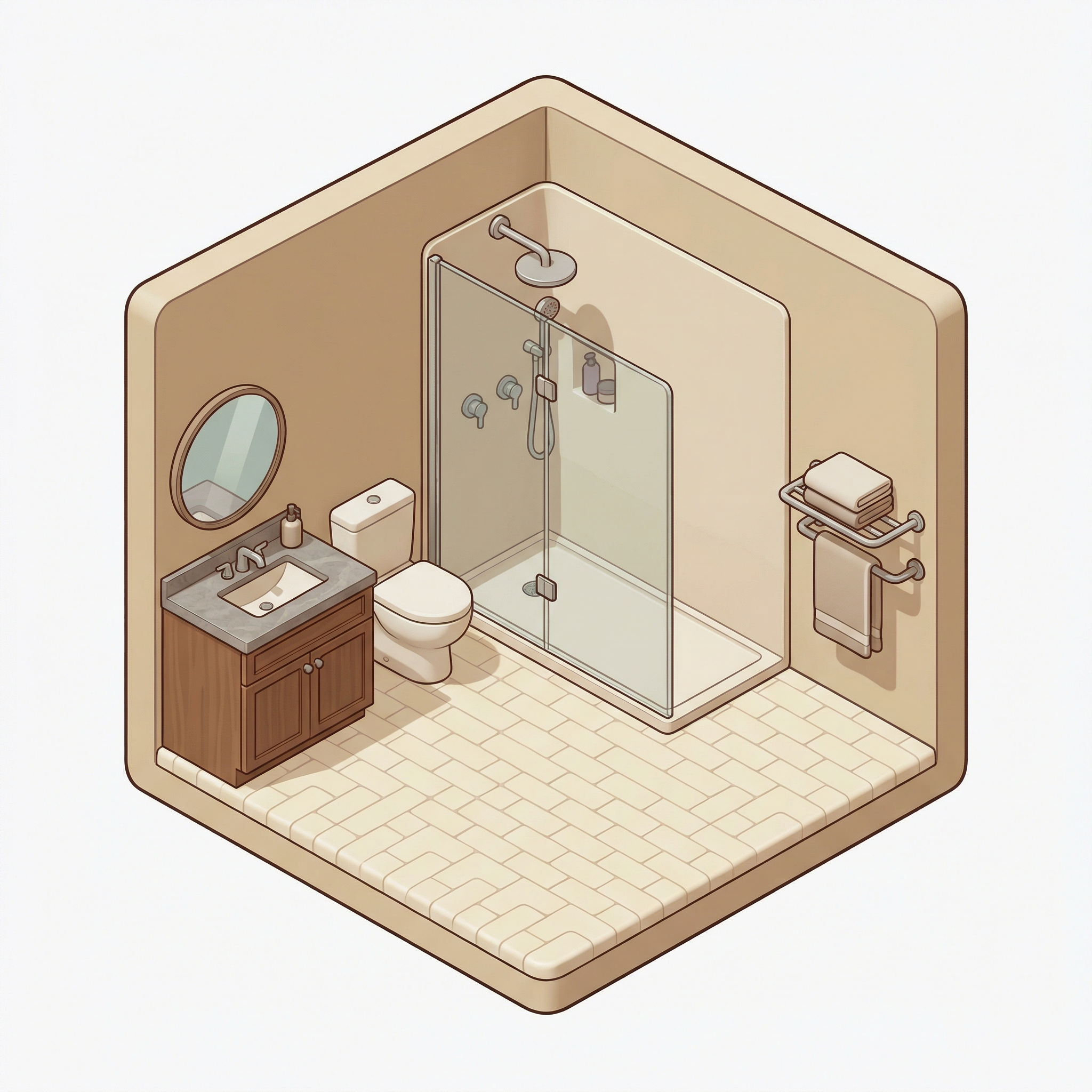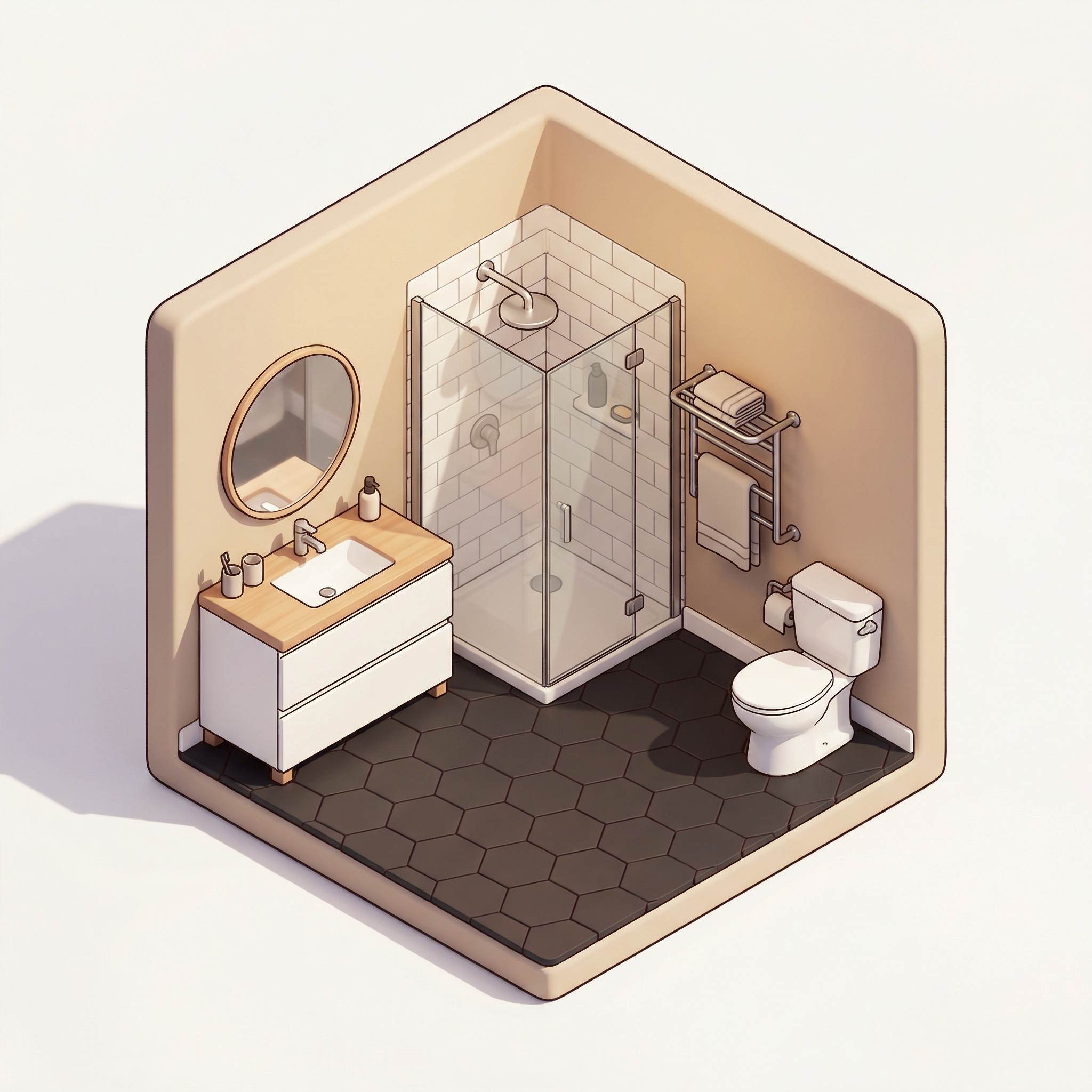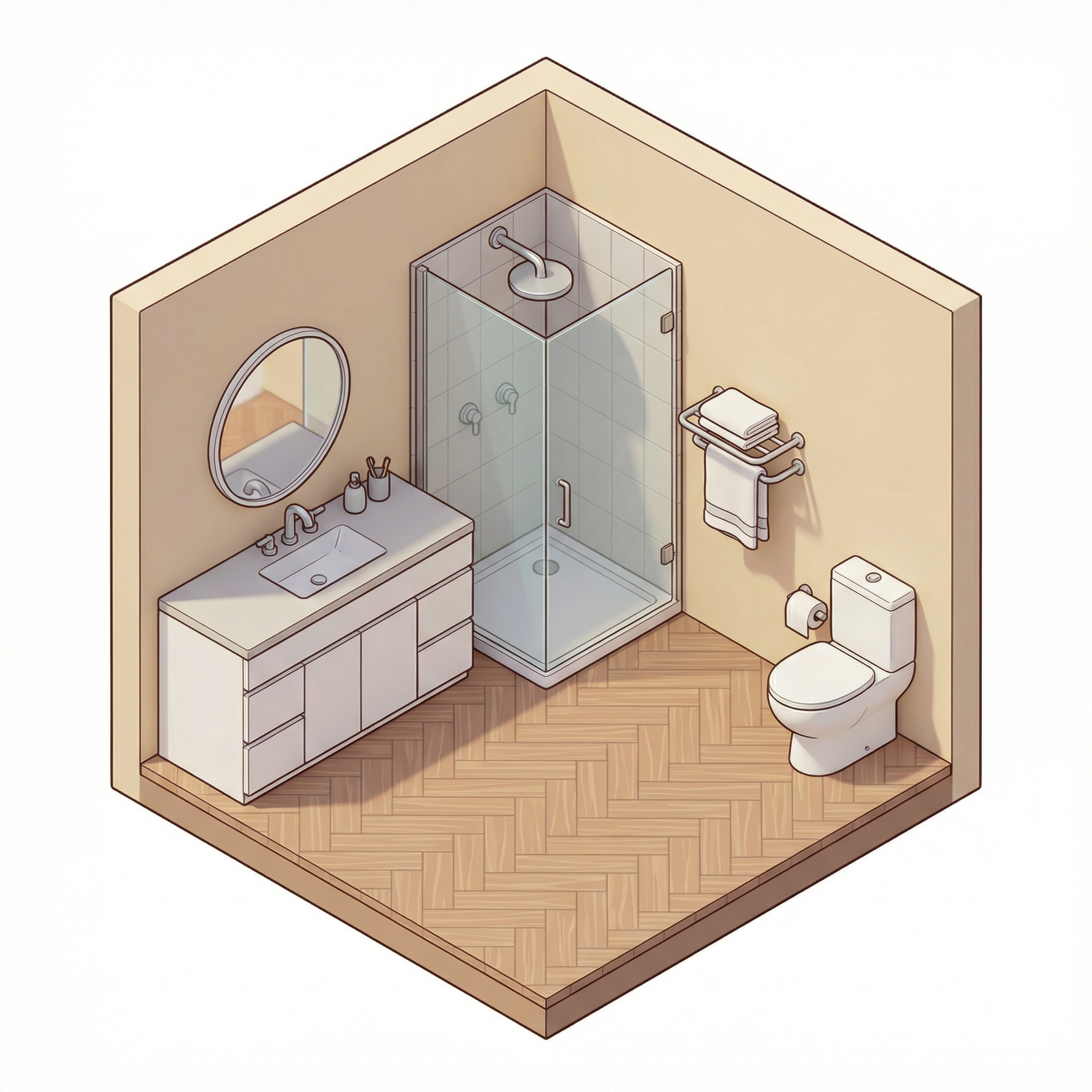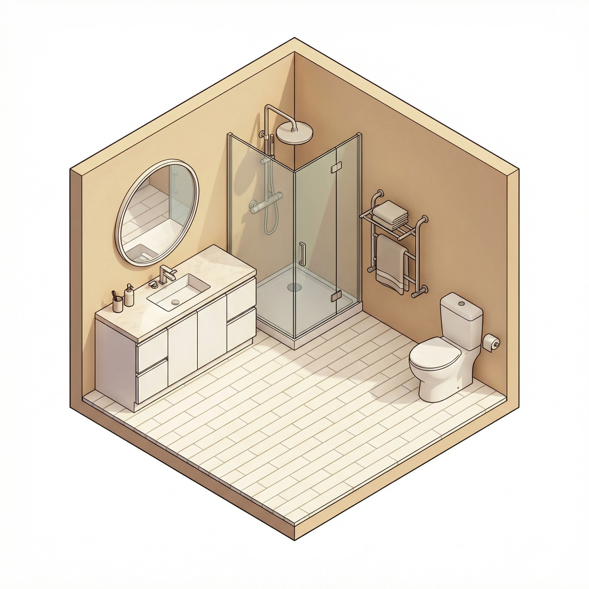 Tap any option to see changes live. Floor tile and vanity swap the 3D scene.